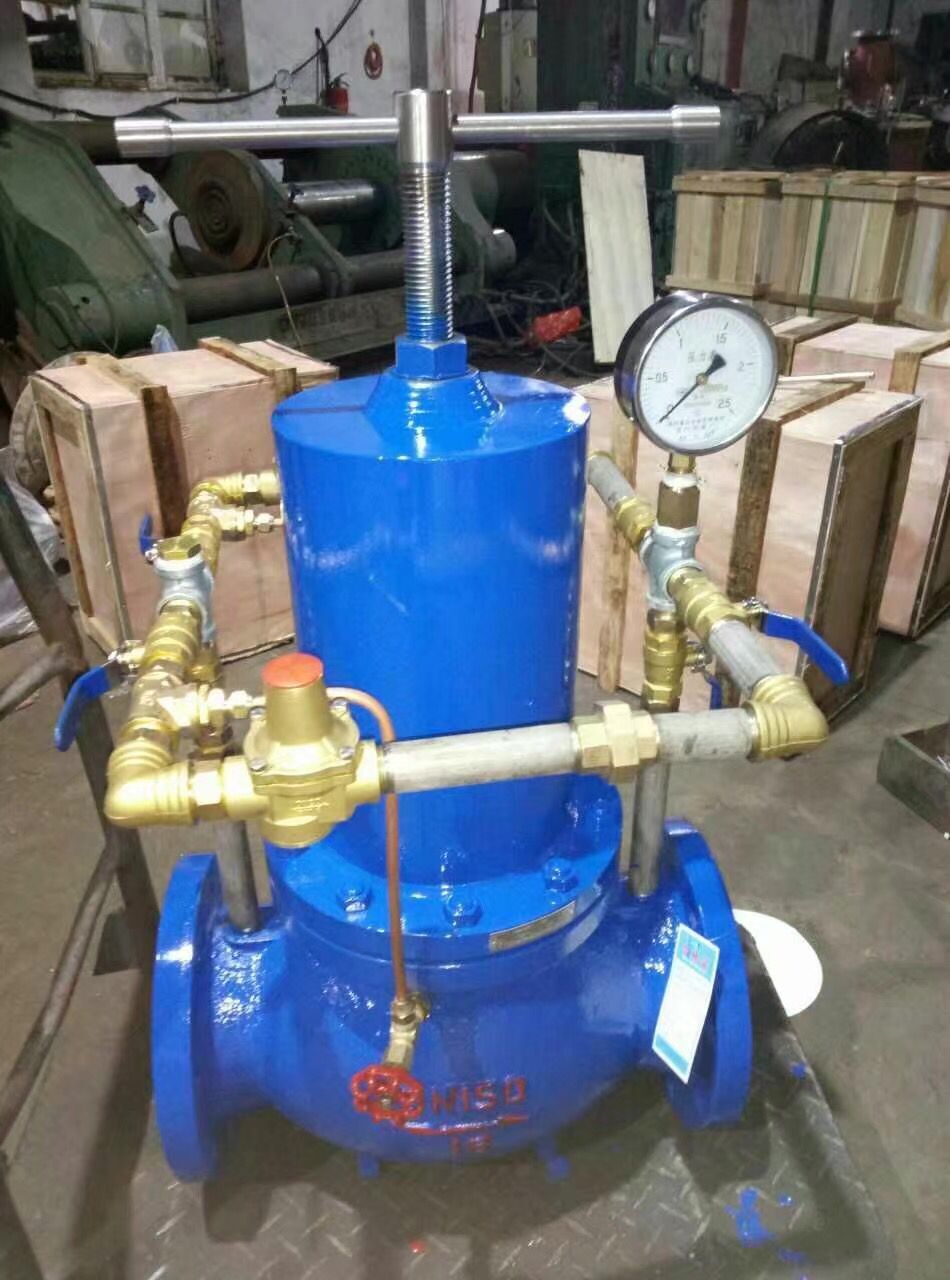 4.1、当出口压力P2调节完成,如右图1所示保留适当的间隙h。 4.2、主活塞下方万一失压时,h消失,自动保护,如2所示。 此时主阀节流锥的开度***大为:H+h,如3所示。 因此,出口压力P2值不会形成危害性的高压。直动式减压阀所示为直动式带溢流阀的减压阀(简称溢流减压阀)的结构图。 内部先导式减压阀当减压阀的输出压力较高或通径较大时,用调压弹簧直接调压,则弹簧刚度必然过大,流量变化时,输出压力波动较大,阀的结构尺寸也将增大。为了克服这些缺点,可采用先导式减压阀。先导式减压阀的工作原理与直动式的基本相同。先导式减压阀所用的调压气体,是由小型的直动式减压阀供给的。若把小型直动式减压阀装在阀体内部,则称为内部先导式减压阀;若将小型直动式减压阀装在主阀体外部,则称为外部先导式减压阀。与直动式减压阀相比,增加了由喷嘴4、挡板3、固定节流孔9及气室B所组成的喷嘴挡板放大环节。当喷嘴与挡板之间的距离发生微小变化时,就会使B室中的压力发生根明显的变化,从而引起膜片10有较大的位移,去控制阀芯6的上下移动,使进气阀口8开大或关小、提高了对阀芯控制的灵敏度,即提高了稳压精度。 在主阀体外部还有一个小型直动式减压阀由它来控制主阀。此类阀适于通径在20mm以上,远距离(30m以内)、高处、危险处、调压困难的场合。 水电站减压阀在技术供水系统上的典型应用