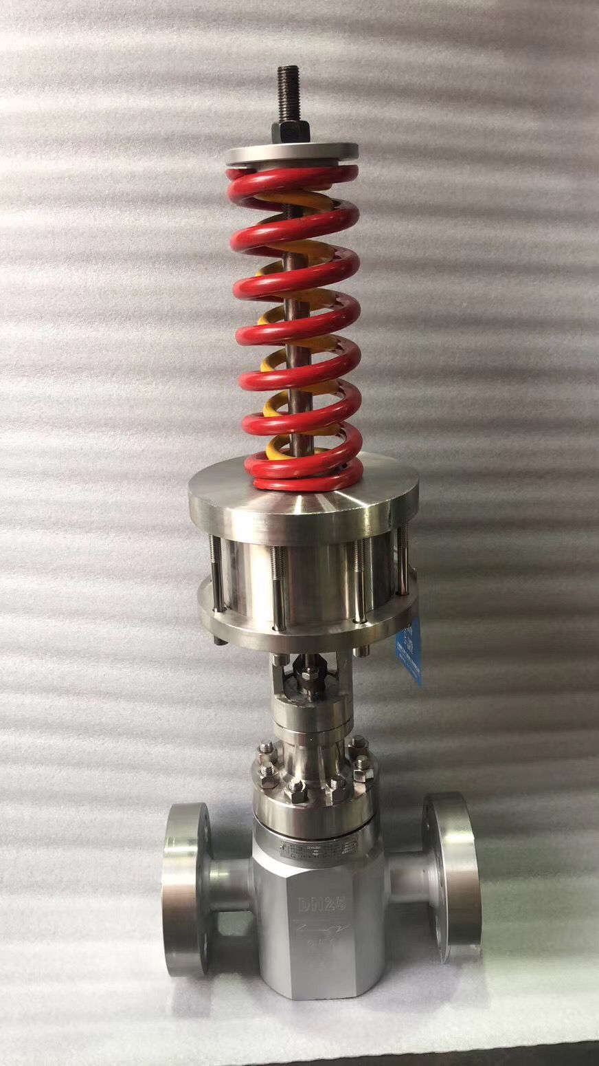 弹簧式自力式压力调节阀工作原理,以常用型阀后式为例,阀芯的初始位置为开启状态,阀后压力P2经导压管输入上膜室作用在执行机构膜片上,其作用力与弹簧的作用力相平衡时的阀芯位置决定了阀的开度,从而控制阀后压力。当阀后压力P2增加时,P2作用在膜片上的作用力也随之增加。此时,膜片上的作用力大于设定弹簧的作用力,使阀芯向着关闭的位置运动,阀的开度减小,P2降低,直到膜片上的作用力与弹簧作用力相平衡为止,从而使P2降为设定值。同理,当阀后压力P2降低时,动作方向与上述方向相反。自力式压力调节阀的阀前式调节其阀芯的初始位置为关闭状态,其力平衡原理与阀后式相同。 a.立即功效型自力式调节阀门立即功效式减压阀便是根据物质自身立即操纵闸阀,做到变压的功效。立即功效式减压阀有阀后取压方式与阀前取压方式。 阀后取压,维持阀后的工作压力在设置范畴内,做到阀后缓解压力的作用。 阀前取压,维持阀前的工作压力在设置范畴内,做到阀前卸压的作用。 b.指引器实际操作型自力式调节阀门指引器实际操作型调节阀门是根据2个闸阀中间的互相操纵,来做到全自动变压的功效。