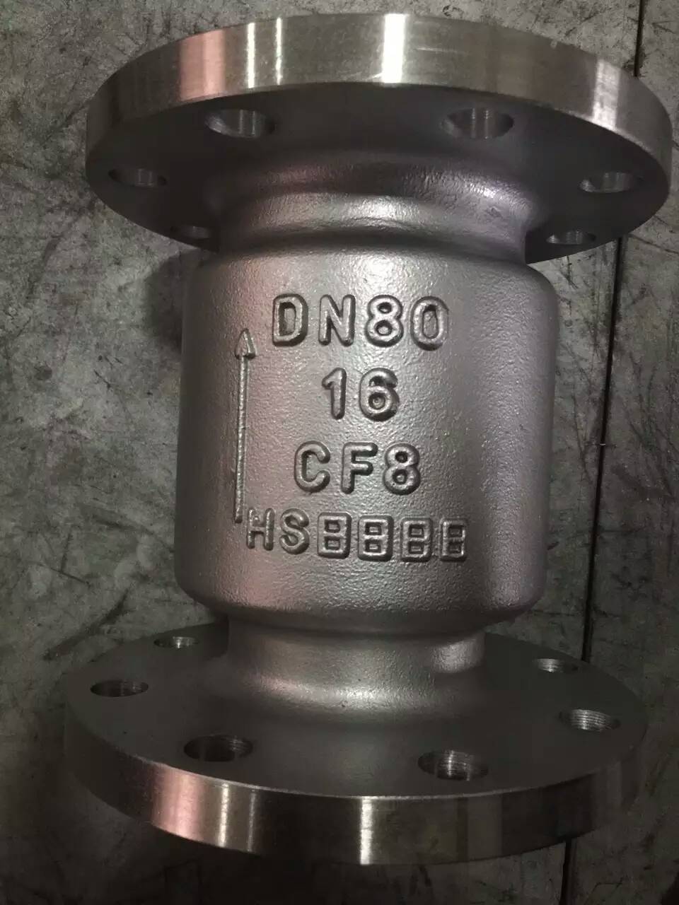H42H升降立式止回阀安装施工说明 H42H不锈钢立式止回阀工作原理:止回阀依靠介质本身的流动而自动开、闭阀瓣,防止介质倒流。本实用新型公开了一种适用于垂直管道的止回阀,主要包括阀体以及设置在阀体内的阀杆、复位弹簧、阀瓣和阀盖环,所述阀体为直角型,所述阀体内还固定设置有阀杆支架,阀杆的一端与该阀杆支架连接,阀杆的另一端与设置在法兰处且与阀体配合的阀盖环连接,阀瓣套接在阀杆上、且位于阀盖环的内侧,复位弹簧套接在阀杆上、且位于阀杆支架和阀瓣之间。与现有止回阀相比,本实用新型采用立式角式阀体设计,即阀体采用直角型,使得其可应用于各种介质的垂直管道,特别是石油、化工及供水垂直管道,并且具有密封性能好,使用维修简单方便等特点。