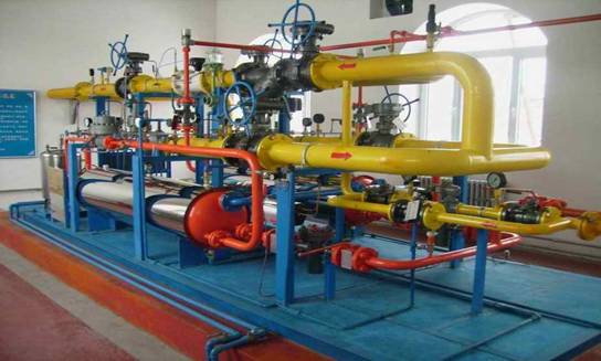 LNG液化天然气供气减压稳压装置设计规范调试: 1、设定压力应遵循由高到低的原则,按步骤一项一项进行,不可操之过急。即:切断压力--放散压力--工作压力。 2、压力设定后,需检测其关闭压力,验证其性能,是否达到要求值。 3、压力设定符合要求后方可开启出口阀门,在此之前不得打开出口阀门,以防意外发生。 4、调试过程中,严禁烟火,防止静电产生,禁止碰撞、敲击管道及设备。 5、阀门开启应缓慢,不得猛开猛关。6、精密仪表应注意保护,以防压力波动大,损坏仪表。 7、在"1+1"调压设备调试中,若需不间断供气,应先通过旁路手动控制压力,一手控制压力调节阀,一手持压力表,时刻观察压力变化,使出口压力维持在所需压力范围内,待调压器压力设定完成后,缓慢打开调压器出口阀门,在调压器正常供气后,再关闭旁路各阀门。 8、若调压器采用"2+0"一开一闭式,两路均需调试,开启一路,关闭一路(备用),备用路中应将进出口阀门间气压泄去,以免调压器皮膜和弹簧受压,造成疲劳。 9、若调压器采用两路自动切换供气,需按主、副路设定压力参数,然后两路进出口阀门保持全开状态,自动切换对调压器性能要求较高,一般稳压精度(AC)≤2.5%,关闭精度≤12为宜。