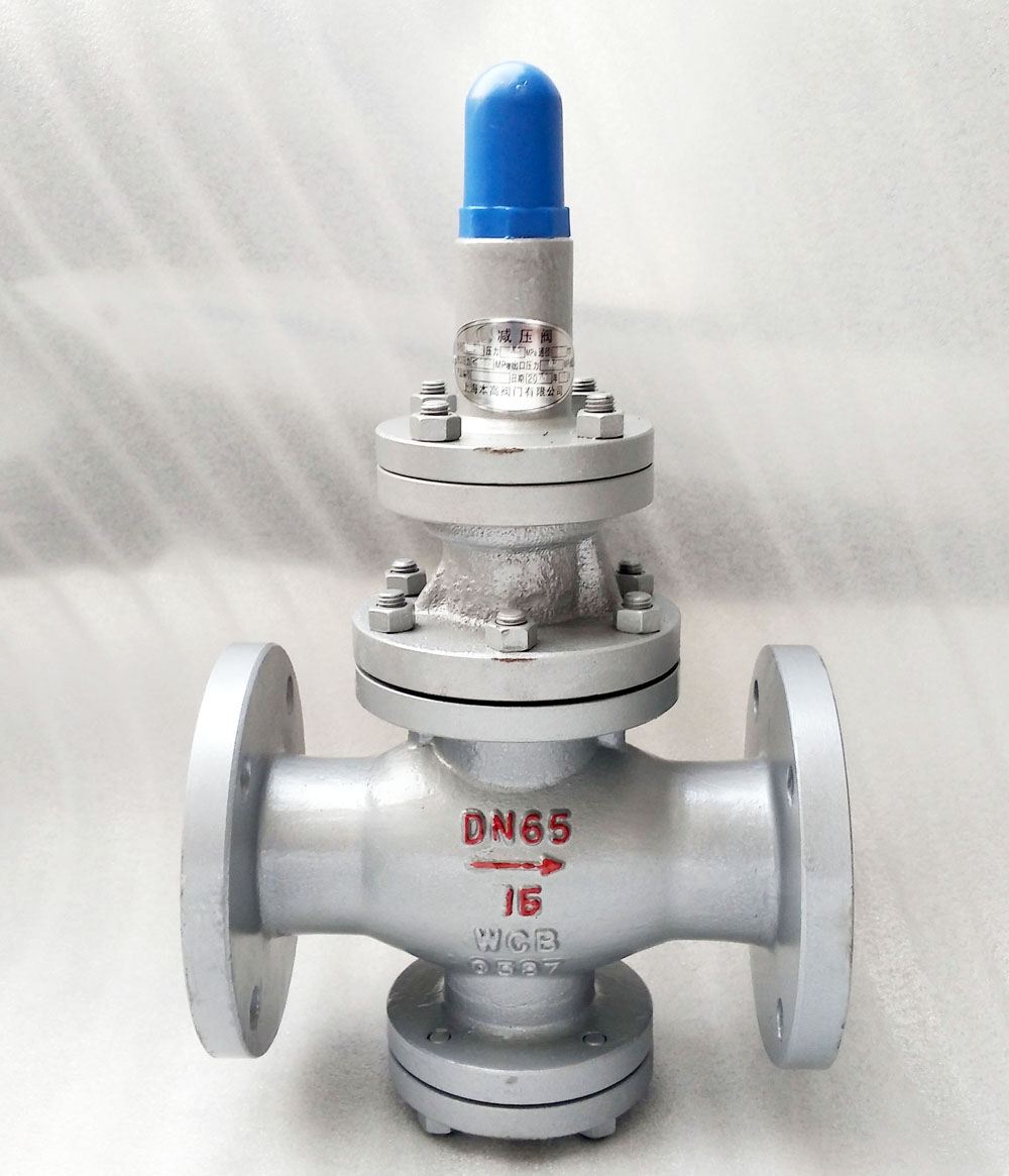 ,是指用于高温热蒸汽或者高温饱和蒸汽场合,比如蒸汽温度为200℃,蒸汽温度250℃,蒸汽温度300℃,蒸汽温度400℃,蒸汽温度450℃的蒸汽管道,能将阀前的蒸汽压力减到所需要的出口压力,并将压力稳定在所需要的压力值的减压阀,属于可调式先导活塞式减压阀。由主阀和导阀两部分组成。主阀主要由阀座、阀阀盘、活塞、缸套、弹簧等零件组成。导阀主要由阀座、阀瓣、膜片、弹簧、调节弹簧等零件组成。通过调节调节弹簧压力设定出口压力,利用膜片传感出口压力变化,通过导阀启闭驱动活塞调节主阀节流部位过流面积的大小,实现减压稳压功能。进口高温蒸汽减压阀主要用于高温蒸汽管路,起到减压稳压作用。