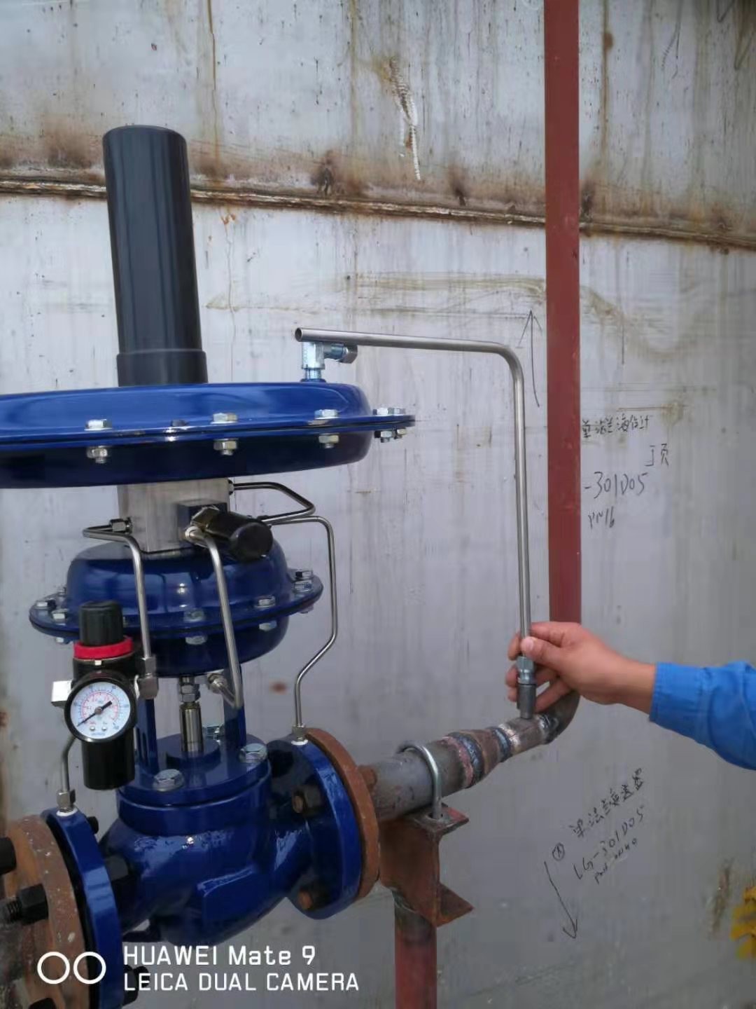 进料导致的储罐区罐顶压力小于阻火呼吸阀6开启压力+1750pa时,没有氮封尾气排放。 进料导致的储罐区罐顶压力大于阻火呼吸阀6开启压力+1750pa时,超压部分氮封尾气通过阻火呼吸阀6排出。 进料停止后储罐区罐顶压力处于高压状态,压力为+1750pa,当任意储罐出料时,储罐区罐顶压力逐步降低,当压力值不小于500pa,不补充氮气。 进料停止后储罐区罐顶压力处于高压状态,压力为+1750pa,当任意储罐出料时,储罐区罐顶压力逐步降低,当压力值不小于500pa,不补充氮气。当压力值小于500pa时,自力式氮封阀5开启,进行氮气补充。 自力式氮封装置调节阀主要由快速泄放阀和自力式微压调节阀,以及压力弹簧、指挥器、脉冲管等相关部件组成,主要用于保持容器顶部保护气体(一般为氮气)的压力恒定,以避免容器内物料与空气直接接触,防止物料挥发,被氧化,以及容器的安全,特别适用于各类大型储罐的气封保护系统.