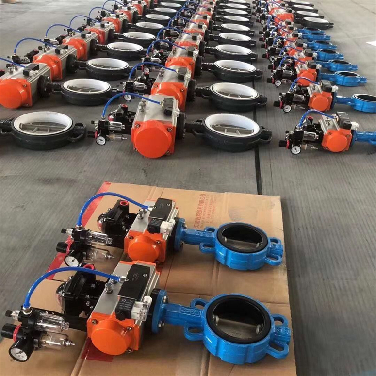 气动对夹凸耳式中线软密封蝶阀技术参数主要特点: 1,小型轻便,容易拆装及维修,并可在任意位置安装。 2,结构简单,紧凑,90°往复回转,开启迅速 3,操作扭矩小,省力轻巧。 4,流量特性趋于直线,调节性能好。 5,启闭试验次数多达数万次,寿命长。 6,达到密封,气体试验泄露为零 8,更换零件材质,配对,可选用多种材质。 气动软密封蝶阀所配套气动执行器及气动附件功能和用途(可选): 1,双作用执行器:控制阀门的开启和关闭。 2,单作用执行器(弹簧复位):在电路、气路切断或者有故障时,自动关闭阀门。 3,单控电磁阀:供电时阀门打开或者关闭,断电时阀门关闭或者打开(可提供防爆型)。 4,双控电磁阀:一个线圈通电时阀门打开,另一个线圈通电时候阀门关闭,有记忆功能(可提供防爆型)。 5,限位开关回信器:远距离传送阀门开和关位置信号(可提供防爆型)。 6,电气定位器:根据电流信号(4-20ma)的大小对阀门的介质流量调节控制(可提供防爆型)。 7,气动定位器:根据气压信号(标准0.02-0.1mpa)的大小对阀门的介质流量调节控制。 8,电气转换器:将电流信号转换成气压信号,与气动定位器配套使用(可提供防爆型)。 9,气源处理三联件:包括空气减压阀、过滤器、油雾器、对气源稳定、清洁、运动部件起润滑作用。 10,手动操作:自动控制在不正常情况下可以手动操作阀门的启闭。