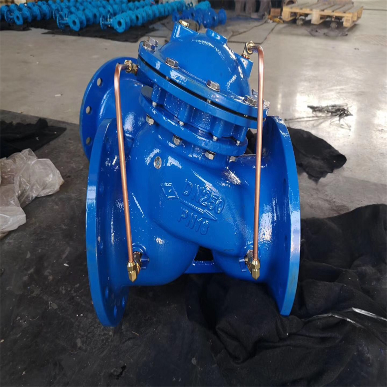 JD745X多功能水泵控制阀结构特点:JD745X多功能水泵控制阀由主阀和调节阀及接管系统组成,阀体采用直流式阀体,主阀控制室为膜片式或活塞式的双控制室结构,控制室比一般水力控制阀增加了一个,增加了对主阀的控制功能,实现了对水泵出口的缓慢开启、全开、缓闭、截止等多功能控制,实现了一个阀门、一次调节对水泵出口的多功能控制。本产品的接管系统采用调节阀控制,通过设定调节阀的开度,可方便实现需要的各项控制参数,如主阀的开启速度、缓闭速度等等。