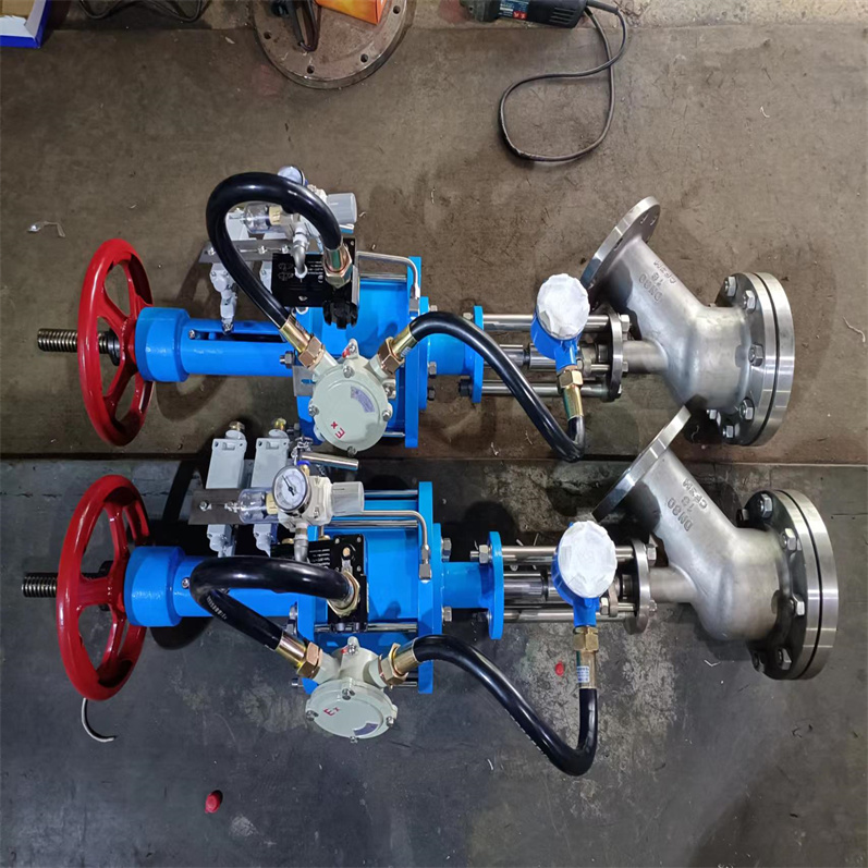FL641H直行程带手动气动带测温放料阀技术参数 气动测温放料阀,其特征在于:所述阀杆的第一端通过一连接卡套与所述气动执行装置的驱动杆紧固连接;所述连接卡套的侧部形成开口,所述温度变送器通过穿设于所述开口的传感线与所述温度探头通信连接。主要用于反应器,储罐和其他容器的底部排料,借助于阀门底部法兰焊接于储罐和其他容器的底部,因此消除介质常在容器底部的残留现象。放料阀根据实际情况的需要,放底结果设计为平底,阀体为V型,并提供提升和下降两种工作方式的阀瓣。阀体内腔装有耐冲刷、耐腐蚀的密封圈,在开启阀门瞬间,可以保护阀体不被介质冲刷、腐蚀,并对密封圈进行特种处理,使表面硬度达到HRC56~62,具有高耐磨、耐腐蚀的功能。阀瓣密封根据需要时封面均堆焊接有硬质合金,密封面采用线密封,保证密封的可靠性,并可防止结疤。同时,采取短行程阀瓣的设计。在化工、石油、冶金、制药、农药、染料、食品加工等行业广泛使用。